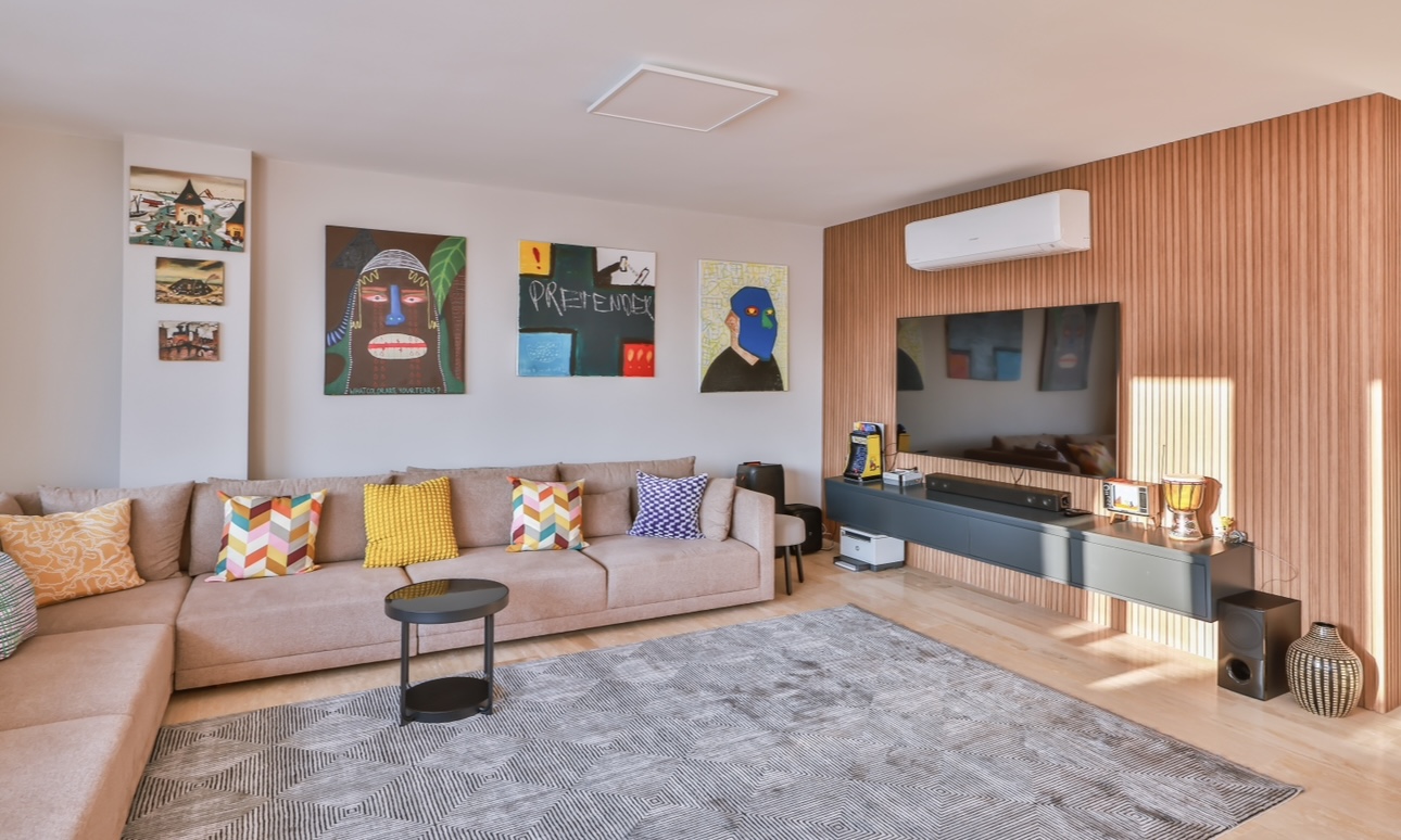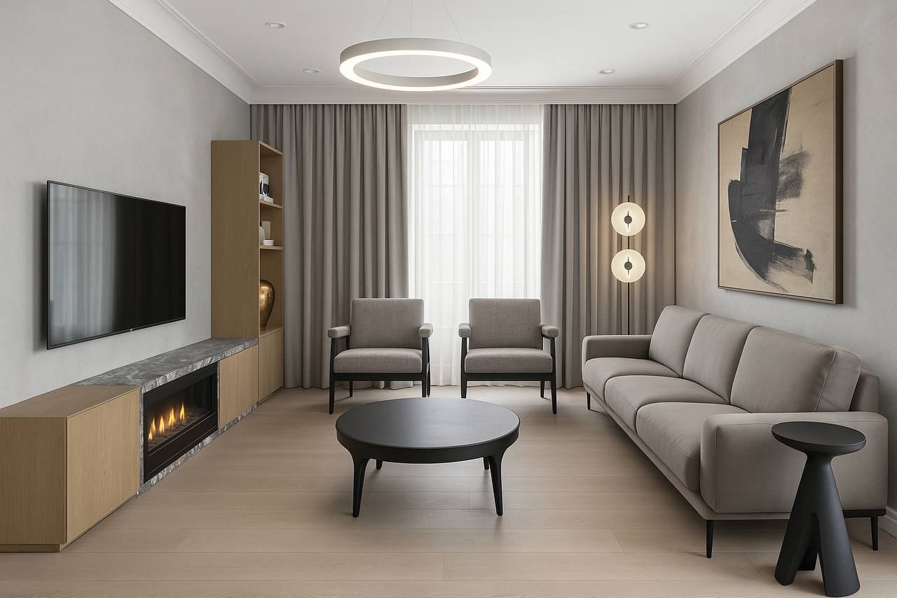 гостиную, собранную вокруг мягкого ковра и фальш-камина, с телевизором на кронштейне, который при желании можно развернуть за стену и смотреть из кровати
