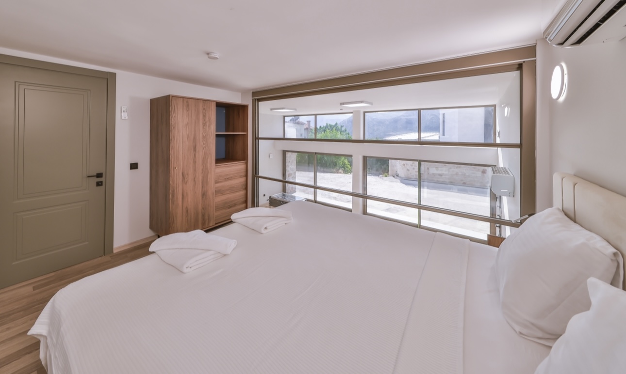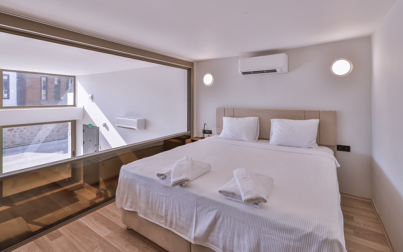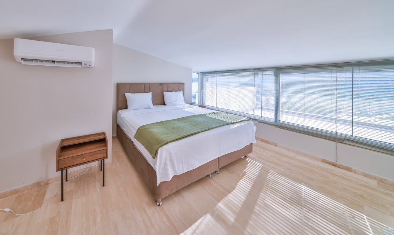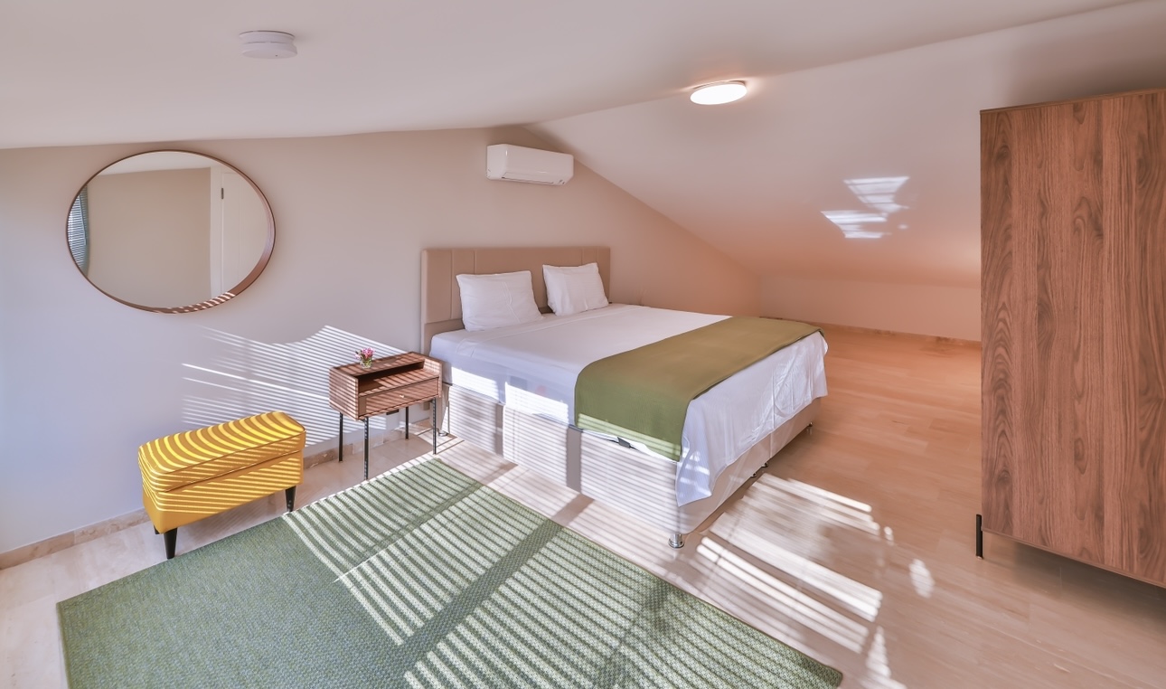 спальню с двуспальной кроватью, где можно создать приватность, задёрнув штору, разделяющую зону гостиной